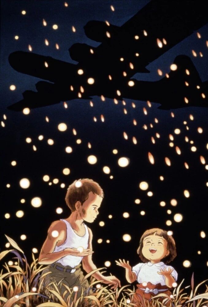 在 《クリスマス(圣诞节) 》一歌里,纯真的少女误把天际的导弹当做流行而许下三个愿望,祝愿生活美好。这副场景多么令人讽刺,又细思极恐,不禁让我想到了 《火垂るの墓 (萤火虫之墓) 》的海报,兄妹两个在草丛中对着萤火虫欢笑,而天空中则是巨大的飞机和密集的炸弹雨。
