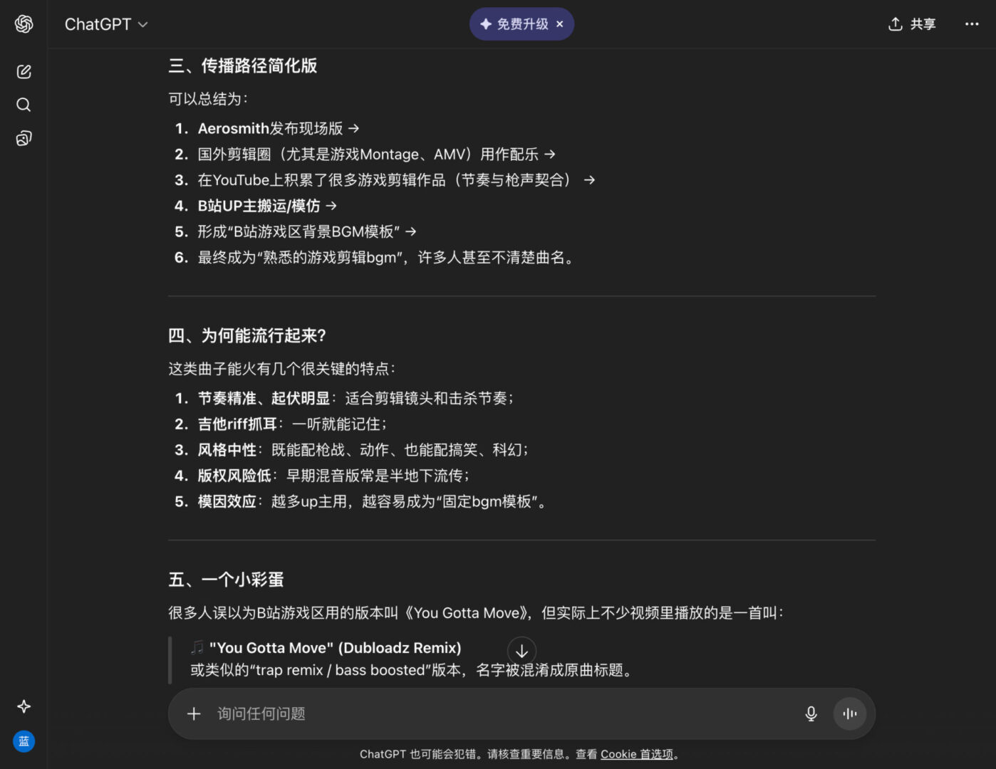 ChatGPT 很准确地查找出了歌曲的源头,但是对歌曲走红的分析有着严重的错误,甚至伪造了 「You Gotta Move (Dubloadz Remix)」 版本的歌曲。