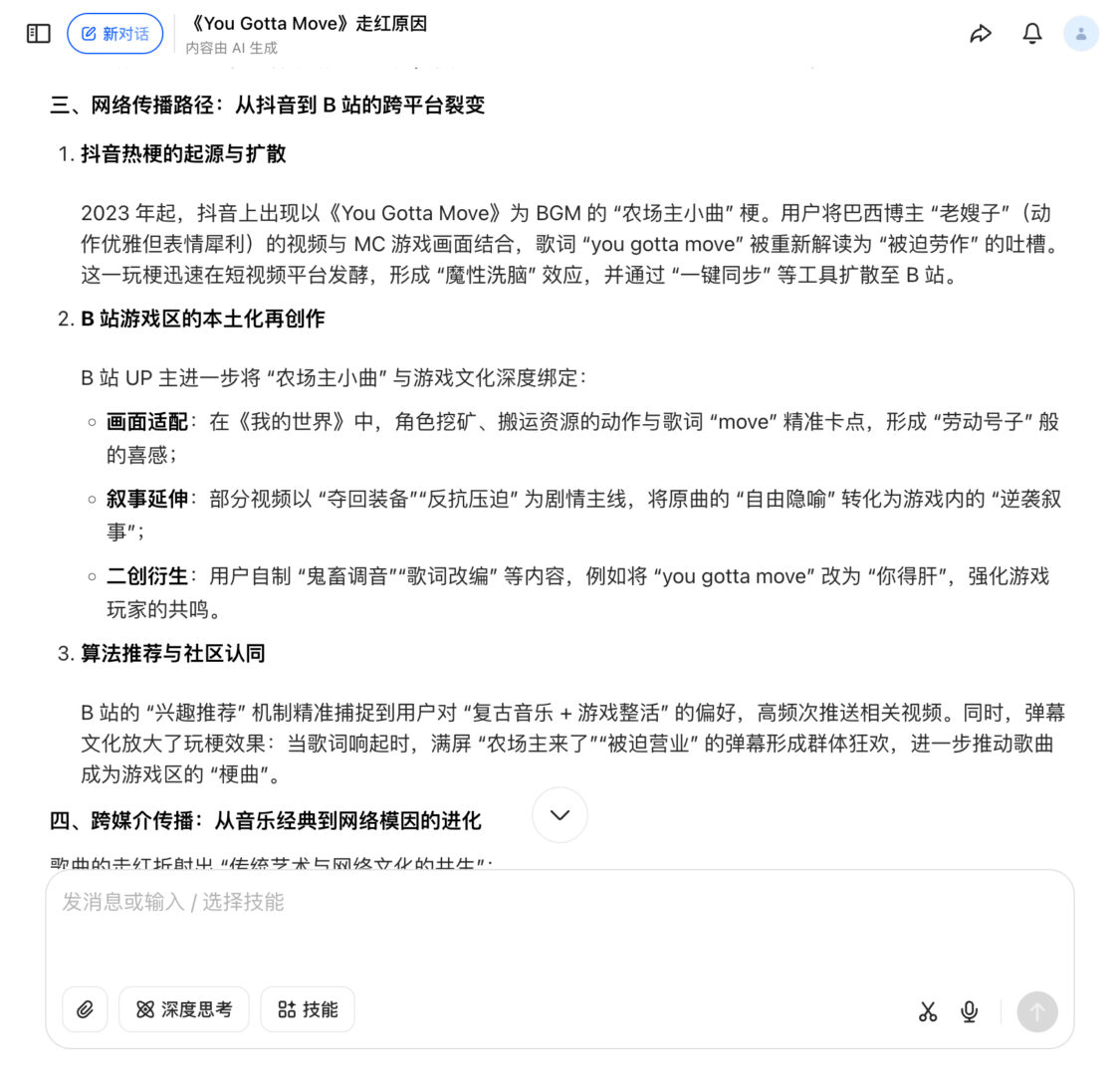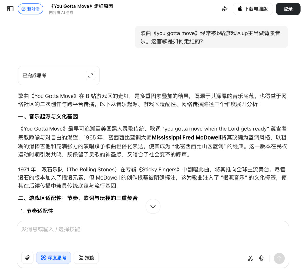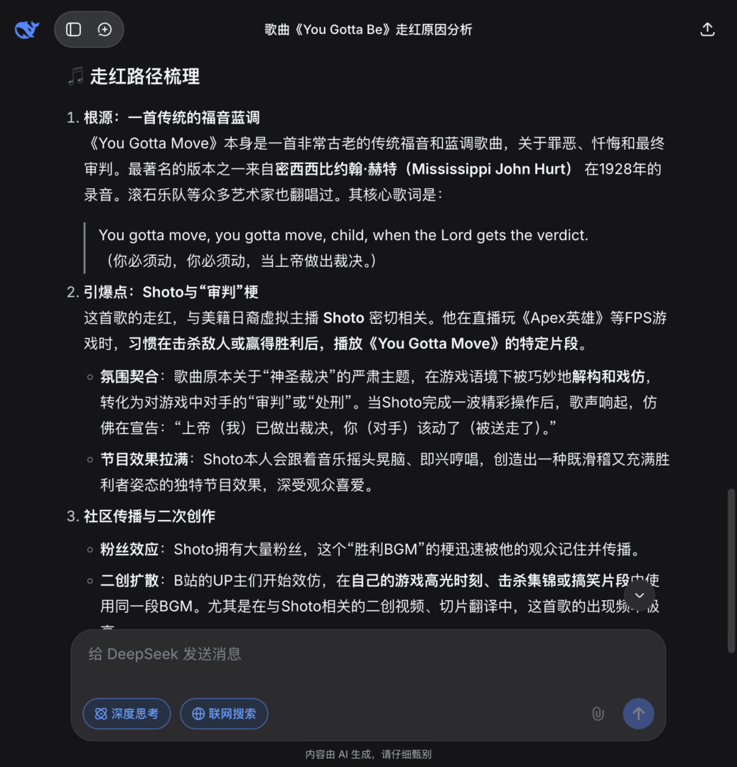 于是我纠正了一次,明确指出歌曲是 《You Gotta Move 》。这下 Deepseek 识别出了歌曲的出处和风格特征,然而总结出走红原因是 「击杀神曲」,似乎与事实相悖。