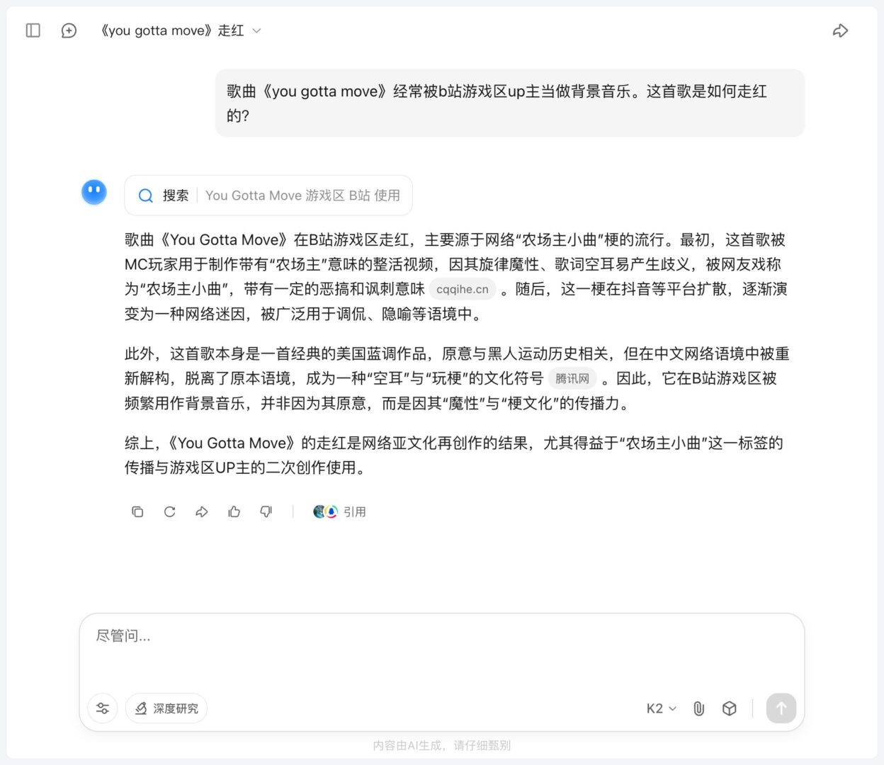 Kimi 简要介绍了 《You Gotta Move 》的起源和走红原因。关键词 「农场主小曲」 与豆包生成答案一致,且在 B 站进行关键词验证是能搜索出相关内容的。